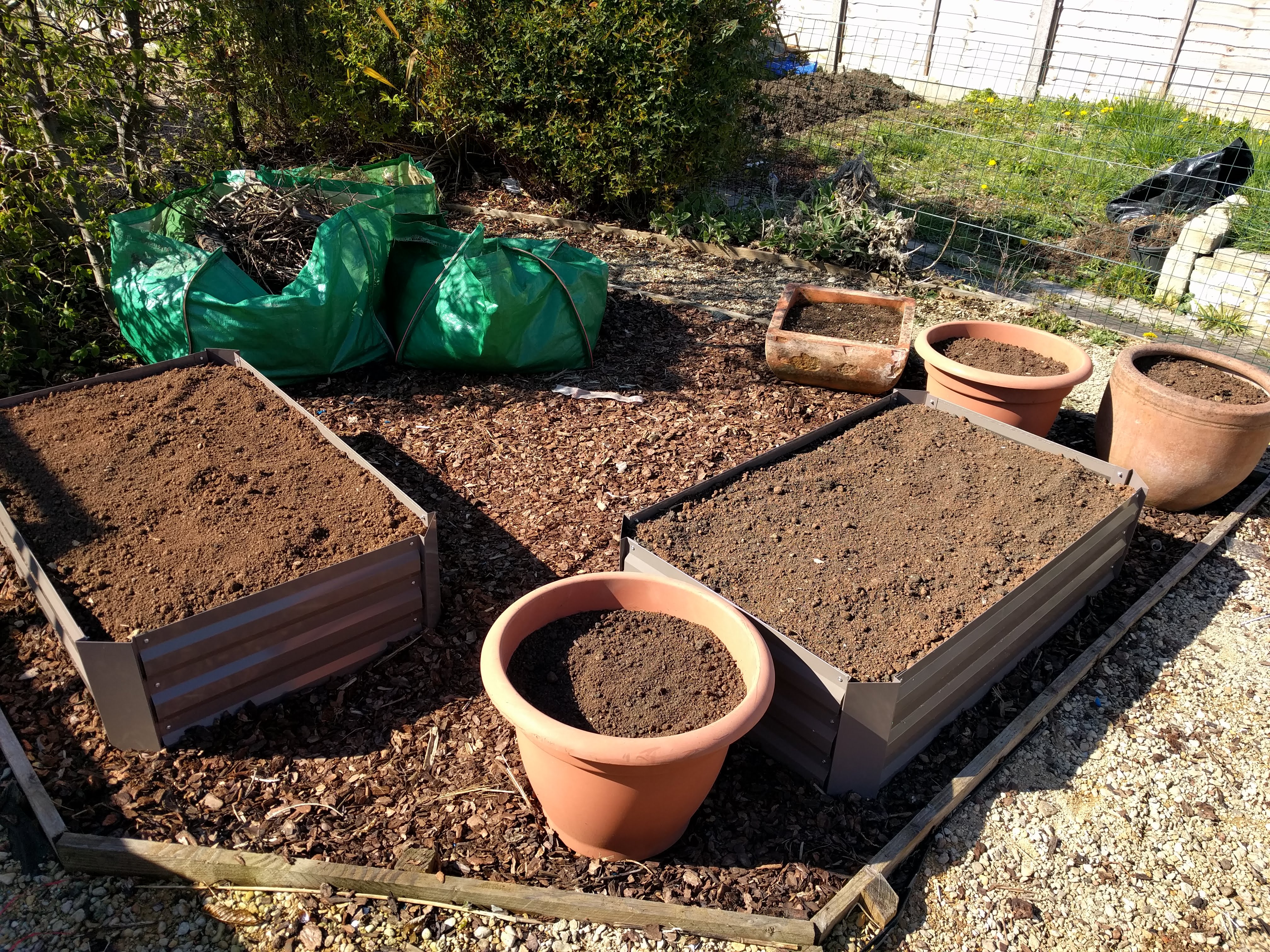 - I expanded the available growing area by using a couple of steel raised beds, planting up more of the pots we had and buying 5 x 35 litre pots, and 4 smaller pots.