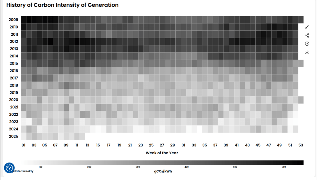 - Data from the Carbon Intensity API which provides an estimate of the carbon intensity of the grid for each half-hour. It provides both historical estimates and forecasts, as well as regional figures. We harvest these in Energy Sparks on a daily basis.